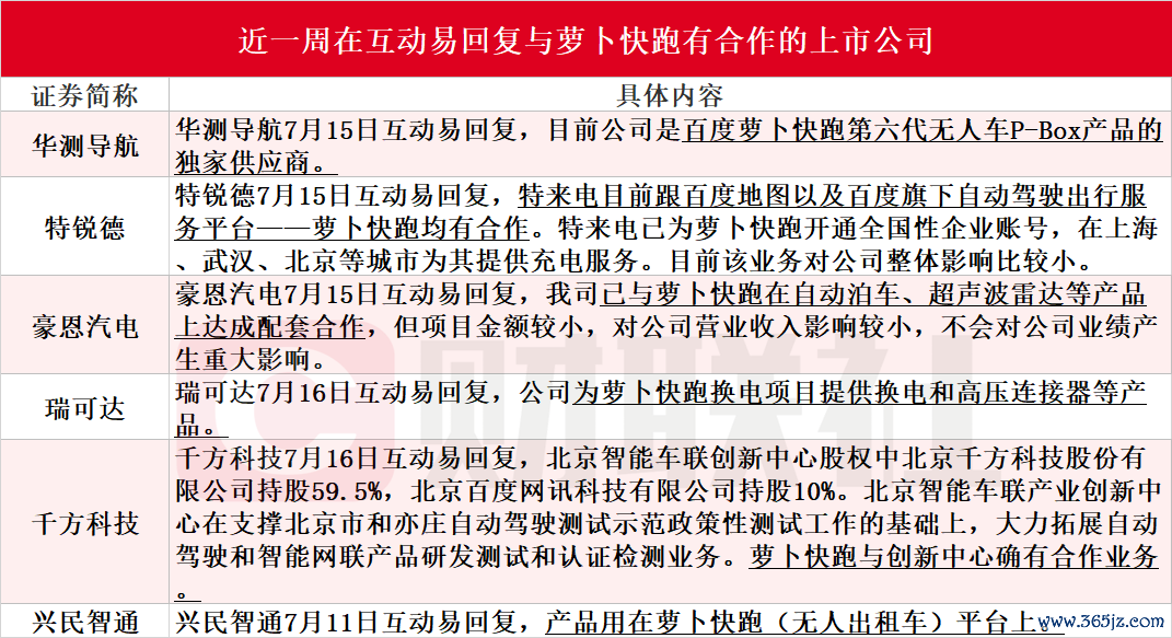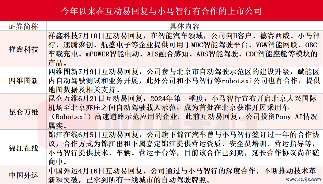 据不完全梳理配资实盘网上配资炒股,近一周在互动平台回复无人驾驶网约车相关业务的A股上市公司包括中科创达、长安汽车、四维图新、天准科技、美格智能、万马科技和中国汽研;近一周在互动易回复与萝卜快跑有合作的上市公司包括华测导航、特锐德、豪恩汽电、瑞可达、千方科技和兴民智通;今年以来在互动易回复与小马智行有合作的上市公司包括祥鑫科技、四维图新、昆仑万维、锦江在线和中国外运。